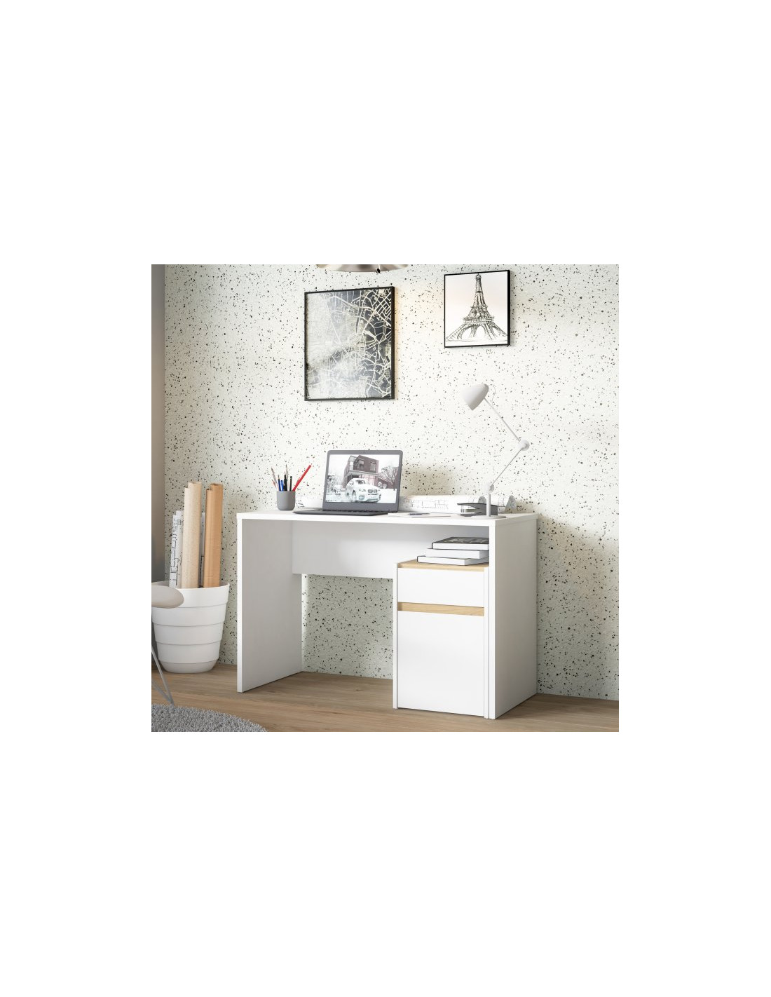 - Biurko w ponadczasowym kolorze bieli z delikatnym akcentem dekoru Dąb Artisan