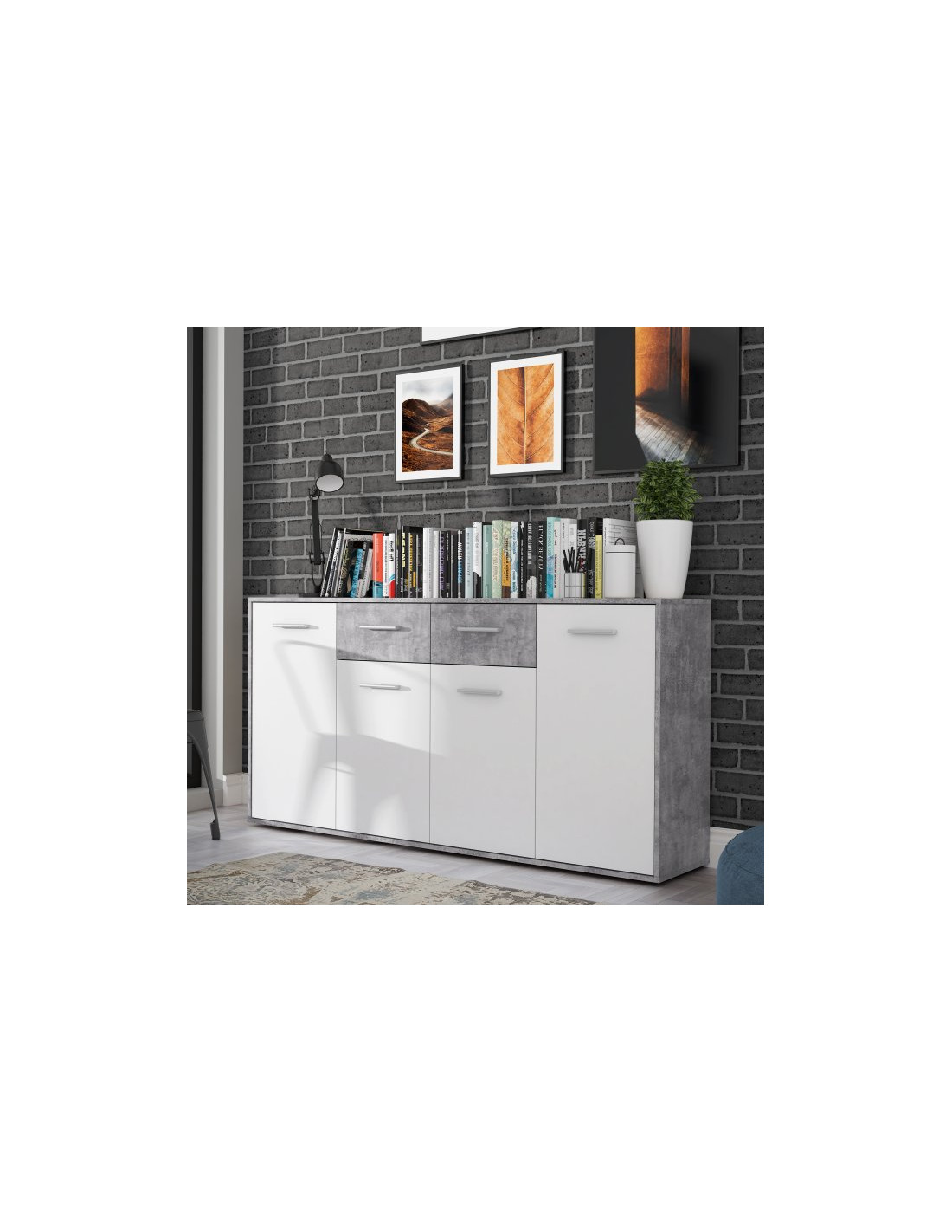 Komoda o szerokości niespełna 165 cm doskonale sprawdzi się w salonie i jadalni w stylu loftowym. Posiada dwie szuflady oraz cztery zamykane szafki. Jej kolorystyka dostosowana jest do współczesnych trendów - korpus w dekorze Jasnego Betonu stanowi idealne tło dla Białych frontów.