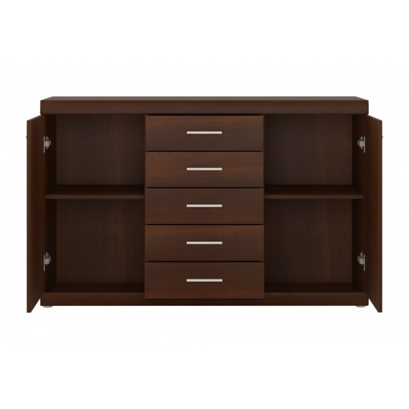 - Komoda z pełnymi frontami, za którymi znajdują się cztery pojemne przestrzenie. W meblu umieszczonych jest również pięć szuflad - dzięki nim możesz przechować wiele mniejszych przedmiotów lub dokumentów.