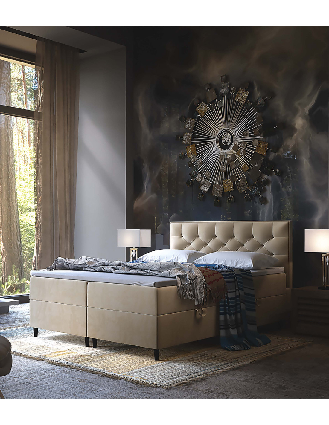 CABO – luksusowe łóżko typu Boxspring z wysokim wezgłowiem 111 cm. Dostępne szerokości 140/160/180×200, wysoki komfort spania dzięki materacom ramowym i topperowi w standardzie.