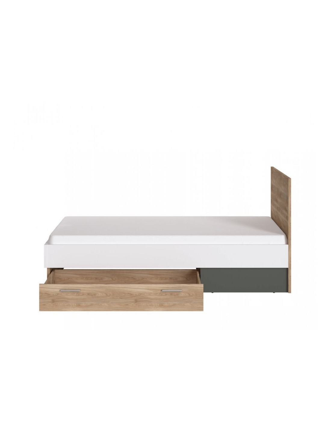 Łóżko pojedyncze Twenty posiada pojemną szufladę, którą dzięki prowadnicom kulkowym możesz wysunąć całkowicie, co znacznie zwiększa funkcjonalność i komfort użytkowania. Stylowe, nowoczesne łóżko o geometrycznej, prostej budowie doskonale wpisuje się w nowoczesny oraz industrialny styl wystroju. Jego ponadczasowa, kontrastowa kolorystyka (Dąb Honey Castello, Biel Alpejska, Szary Grafit) oraz minimalizm uchwytów zapewniają uniwersalność w doborze dodatków do wnętrza.
