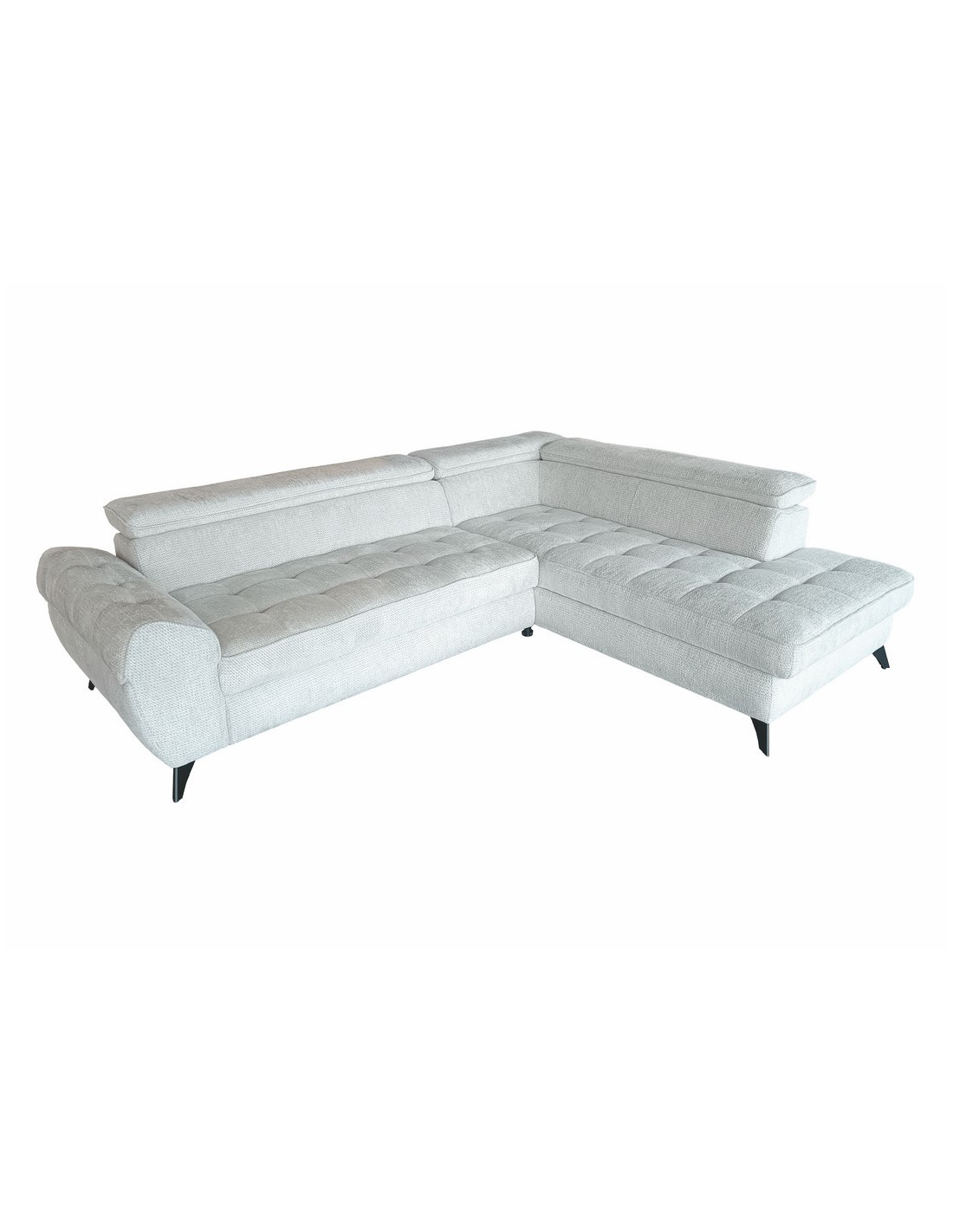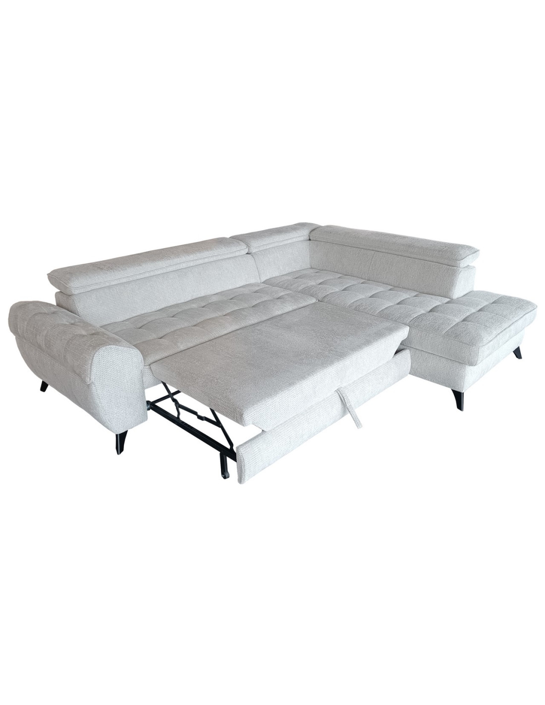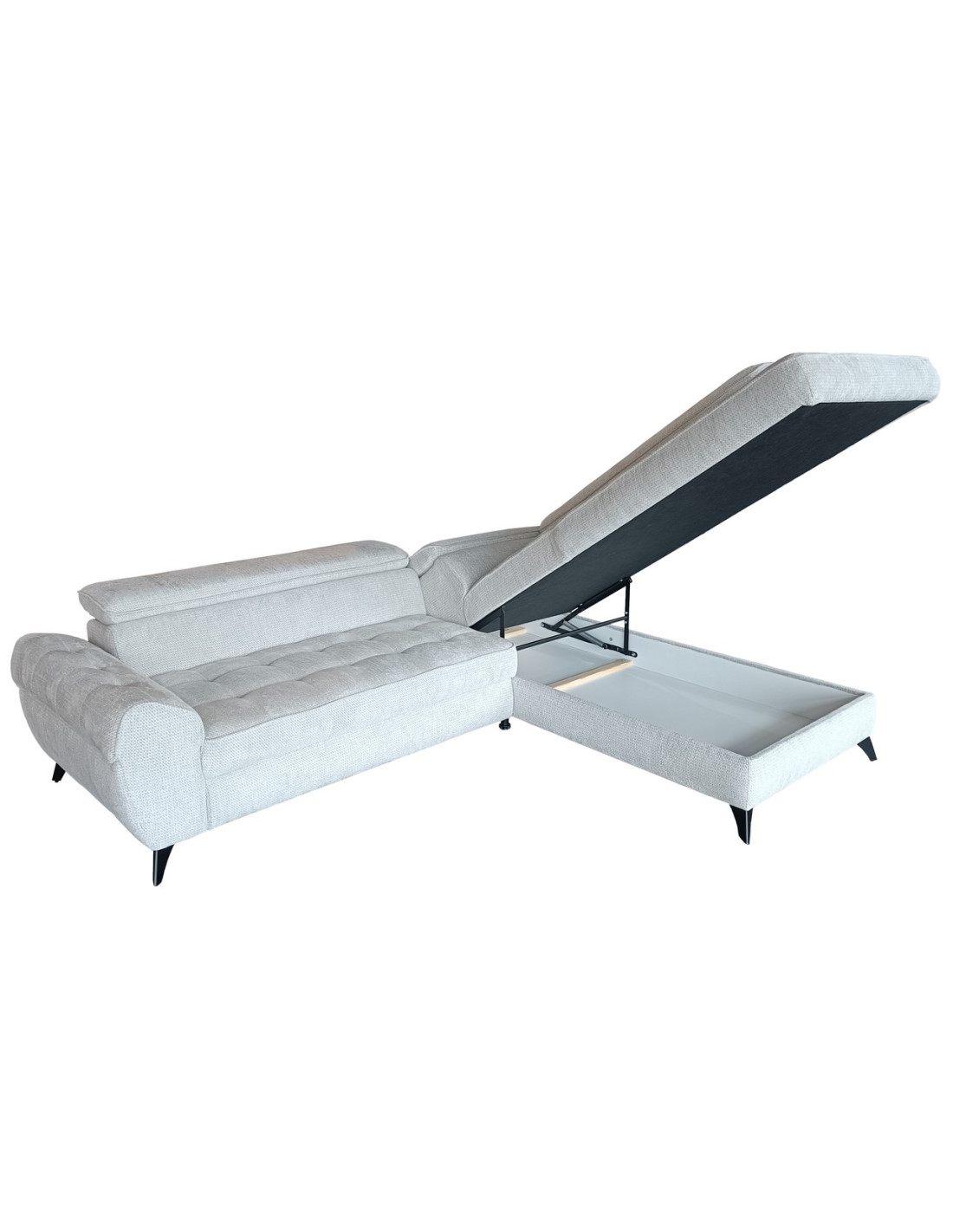 Nowoczesny narożnik z funkcją spania, pojemnikiem na pościel i ruchomymi zagłówkami