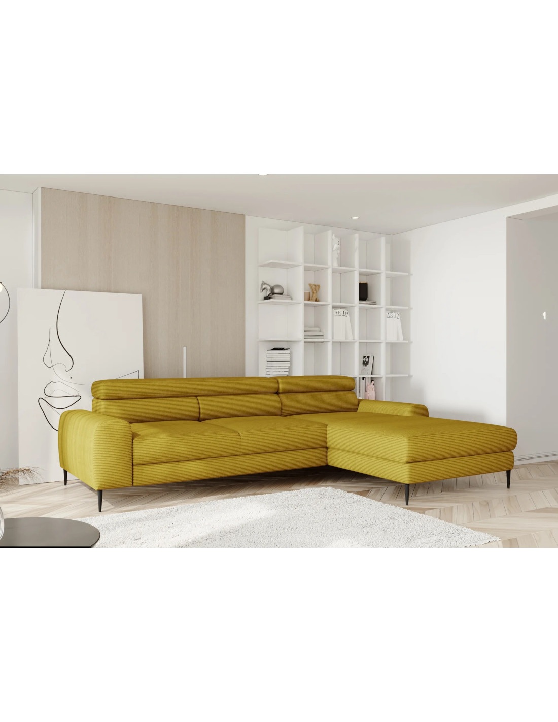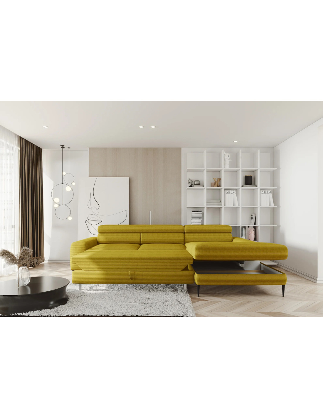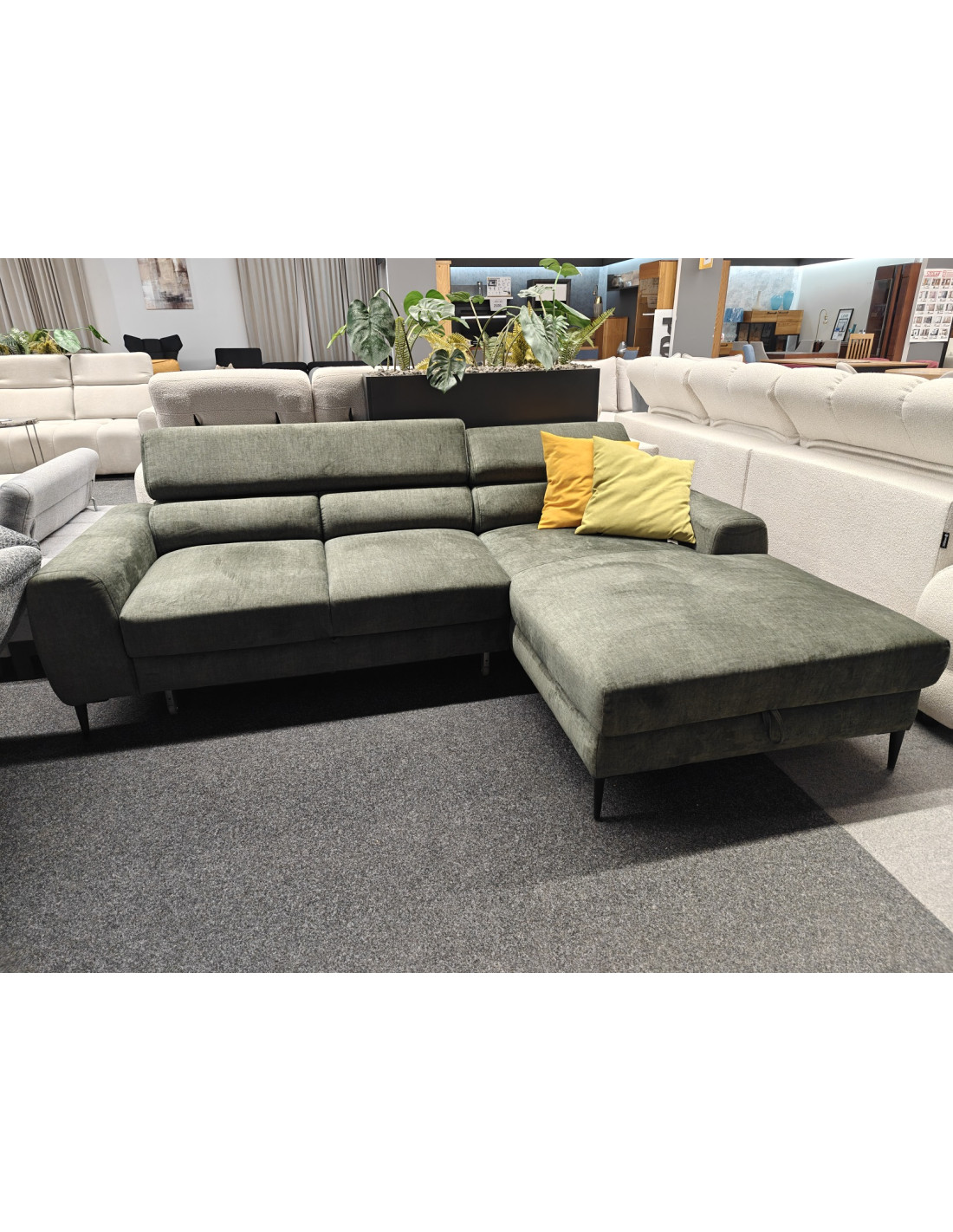 To nowoczesny i wielofunkcyjny model, który został wyposażony w regulację 2 ruchomych zagłówków. Dzięki temu w pełni dostosowuje się do użytkownika, umożliwiając przyjęcie idealnej pozycji. Narożnik posiada funkcję spania oraz pojemnik na pościel, w którym można przechowywać komplet pościeli.