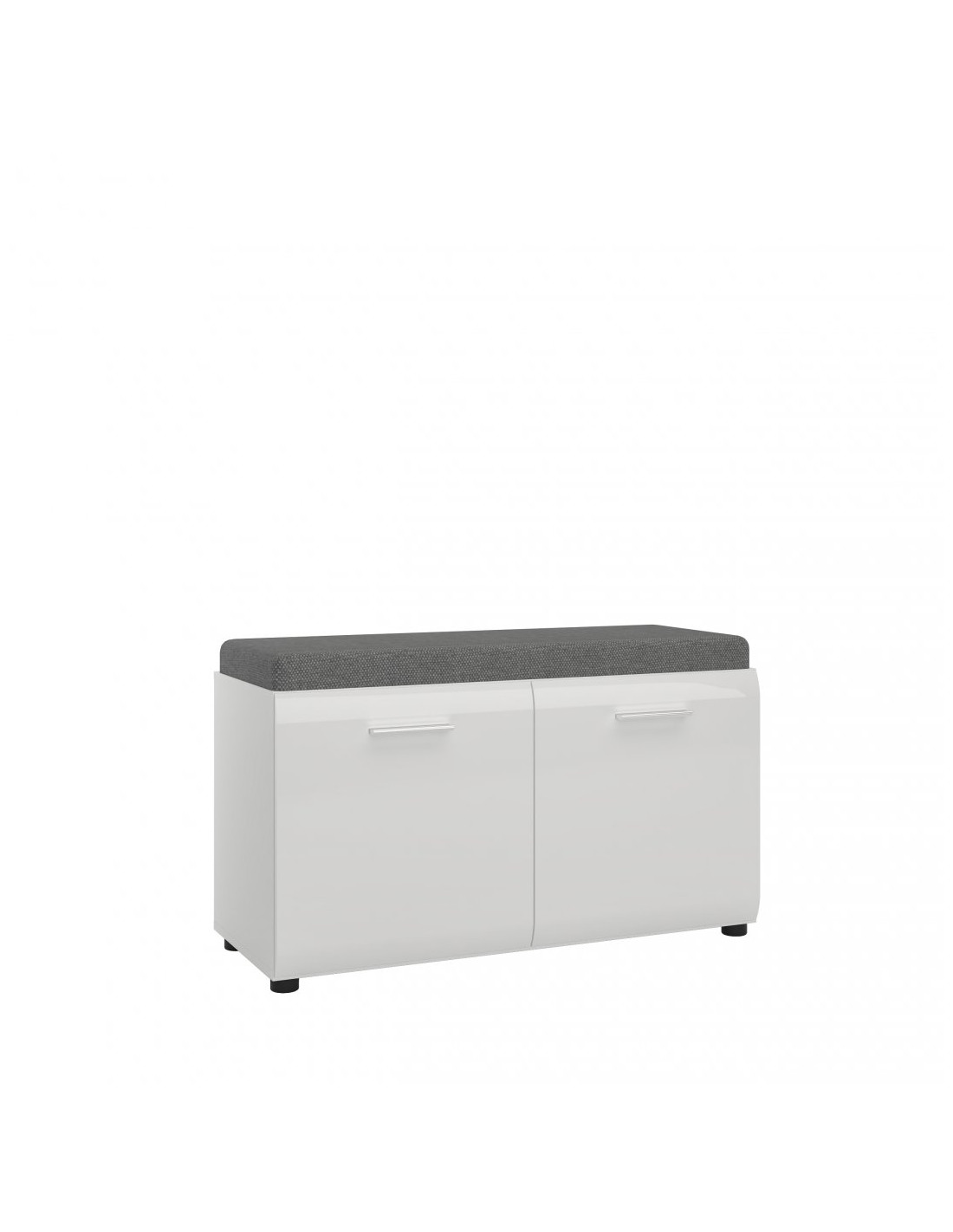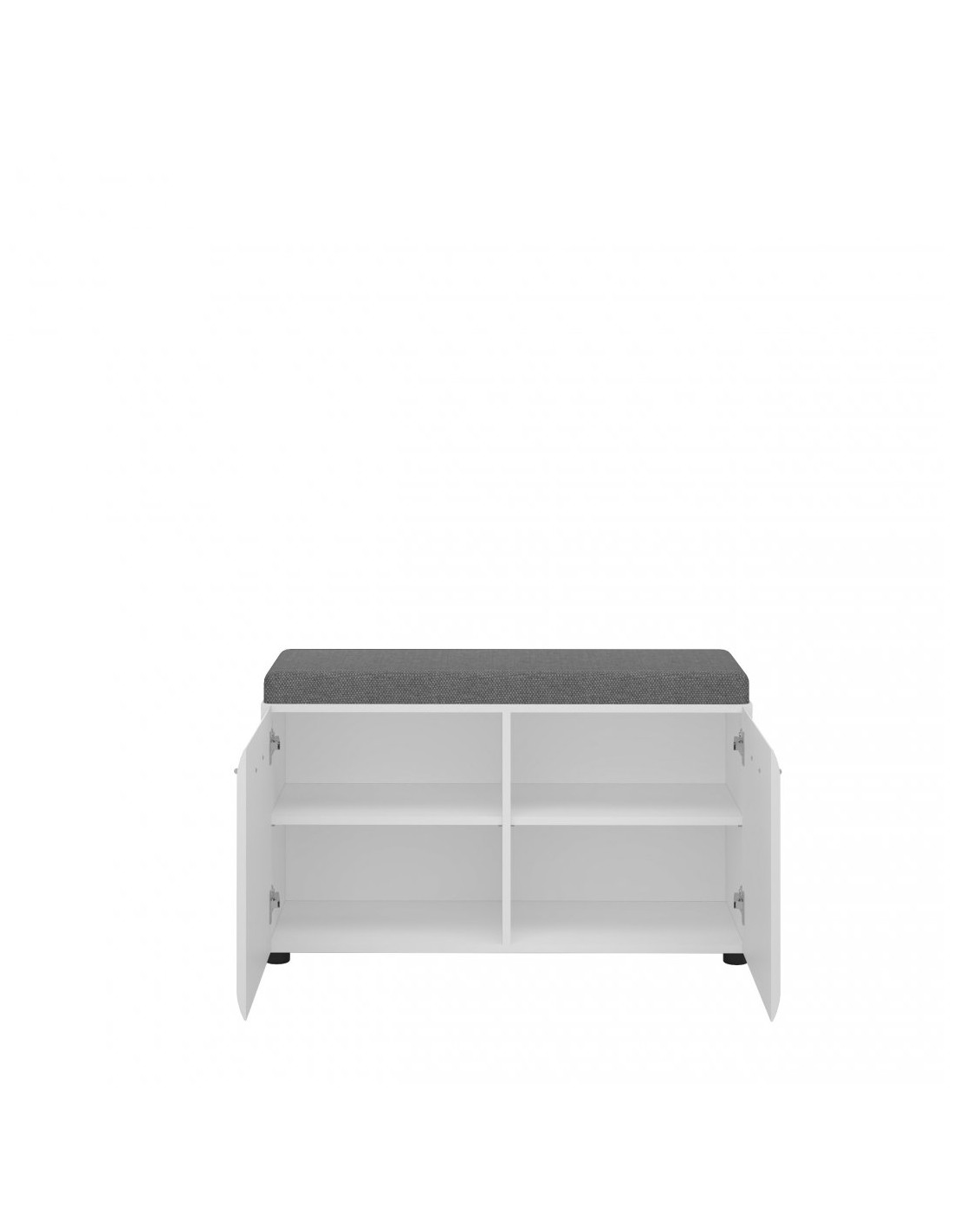 - Nowoczesna szafka na buty Merano wyposażona została w wygodne i niezwykle estetyczne siedzisko w kolorze szarym. Dodatek posiada zdejmowany pokrowiec, dzięki któremu łatwo utrzymać go w czystości. Efektownie kontrastuje kolorystyką z bielą frontów i korpusu mebla. Szafka wykonana została z płyty wiórowej laminowanej w odcieniu Biała Alpejska, a jej fronty drzwiowe pełne, osadzone na zawiasach puszkowych powstały z zastosowaniem płyty MDF.