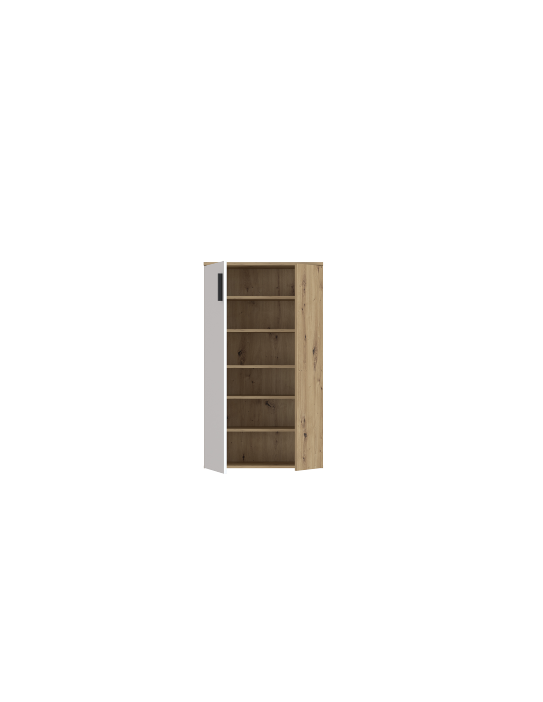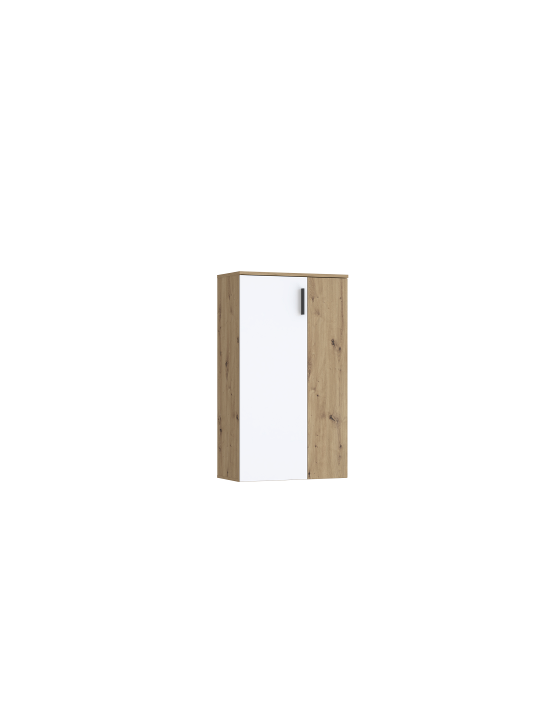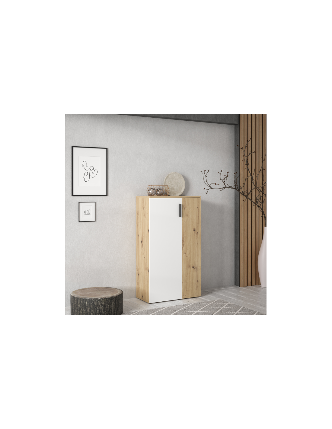 • Szafka na buty wykonana w efektownym połączeniu dekorów: Biały / Dąb Artisan