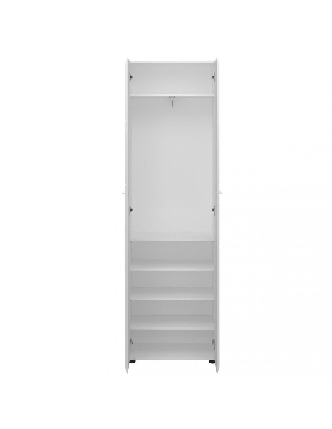 - Praktyczna szafa dwudrzwiowa Merano wykonana została z płyty wiórowej laminowanej i płyty MDF. Prosta bryła znakomicie prezentuje się z białymi frontami, utrzymanymi w wysokim połysku. Całość dopełniają minimalistyczne uchwyty, wykonane z tworzywa sztucznego. Elegancka szafa do przedpokoju cechuje się niewielką głębokością, zapewniając możliwość aranżacji małego wnętrza. W zestawie znajduje się wysuwany wieszak na odzież wierzchnią oraz półki. Biała szafa, której korpus powstał w ponadczasowym odcieniu bieli alpejskiej osadzona została na trwałych, solidnych nóżkach, wykonanych z tworzywa sztucznego. Zawiasy puszkowe frontów drzwiowych gwarantują niezawodne użytkowanie.